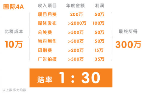 先看国际4A比稿的赔率。(以服务一间中型企业的年度广告为例)