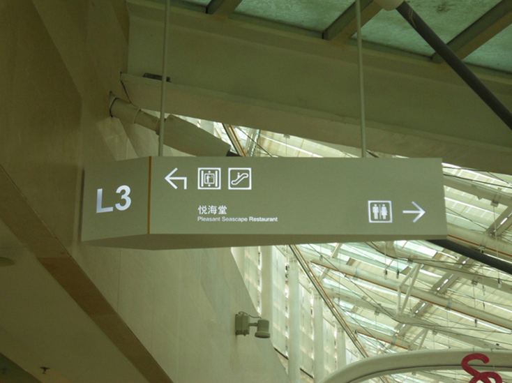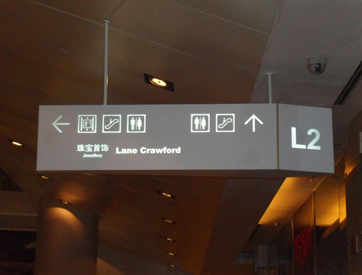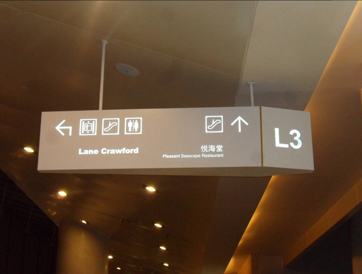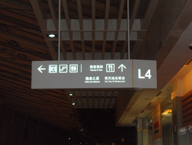 2012 年3 月份该项目启动,我公司为该项目设计购物中心和写字楼导视设计。 工艺材料:导向标识部分:造型不锈钢折弯+ 图文金属烤漆+ 内置光源 工作流程: