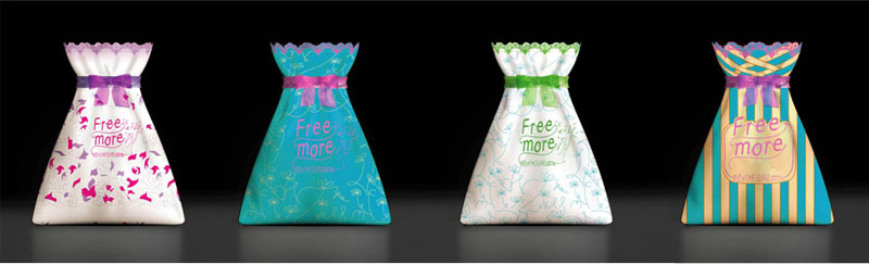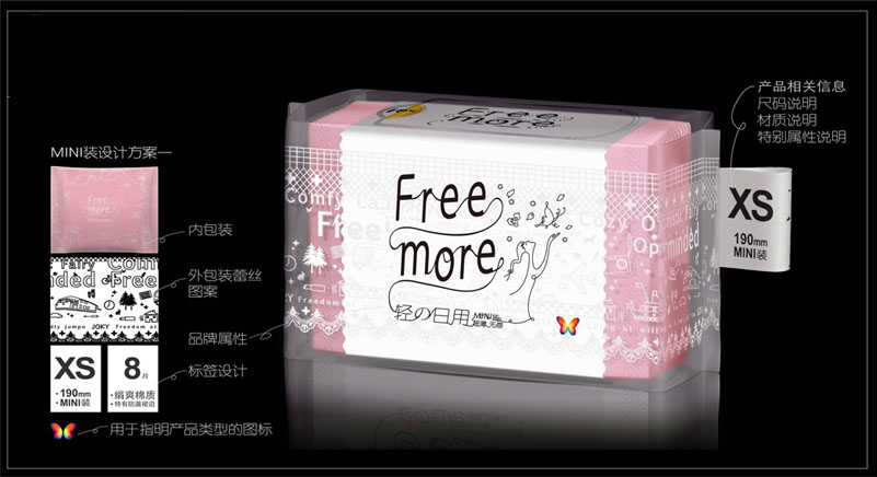 花瓣、翅膀、卫生巾功能图案。我们说,谁说卫生巾的包装必须一看就象卫生巾?如果我们假设,卫生巾 = 女性的贴身时装从此,女性卫生用品的游戏规则将全面改变!