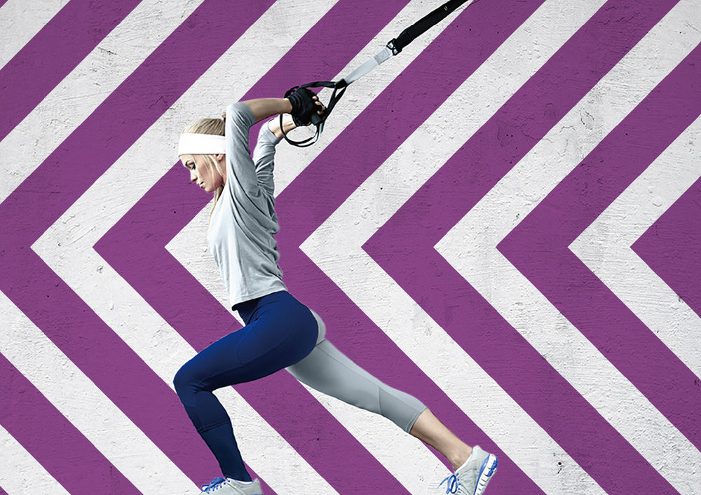 因此我们把健身各种动作(拉,举,扩,扭…),以及出现在健身房数字元素(时间,重量…)以视觉化图形表现,再结合富有节拍感的色彩节奏,突出健身的年轻活力。